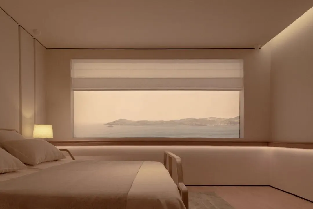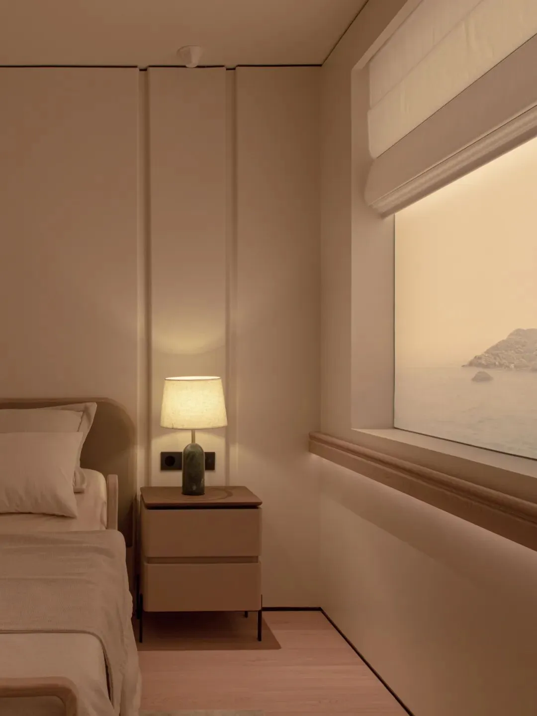主卧以温暖的织物、光线营造出绝佳的休憩氛围,窗外是以惠州的山海为背景的灯膜,山峦在云海中若隐若现,如同是在水墨画中晕染而出。
