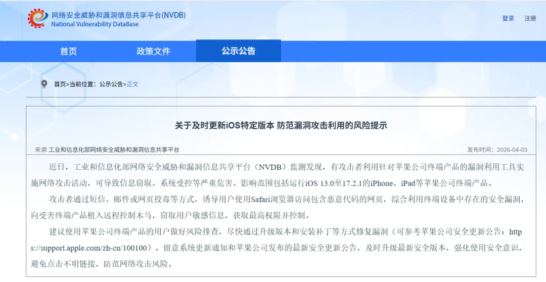 2026年3月18日,多家安全研究公司披露,iOS 18.4至18.7版本存在重大漏洞风险。一款名为DarkSword的黑客工具能够利用该漏洞远程操控受影响的苹果设备,可能导致用户财产损失等严重后果。随后,国家网络安全威胁和漏洞信息共享平台(NVDB)也紧急发布了风险提示,且iOS 13.0 至 17.2.1等旧版本也存在漏洞风险。