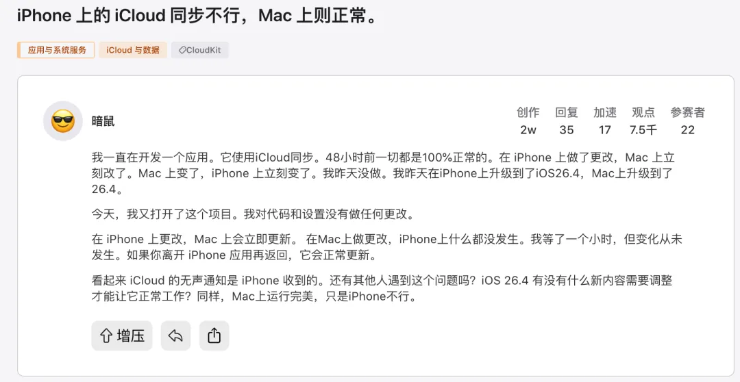 苹果最近的iOS 26.4.1软件更新修复了一个影响iCloud数据同步的关键漏洞。根据公司开发者论坛上的一个帖子,该漏洞出现在iOS 26.4版本,影响了依赖CloudKit框架应用的云数据同步。简单来说,这个问题导致一个设备上的更改无法传递到其他苹果设备。该漏洞不仅影响了第三方应用,还影响了苹果自家的密码应用。被盗设备保护会自动开启于受管理设备
