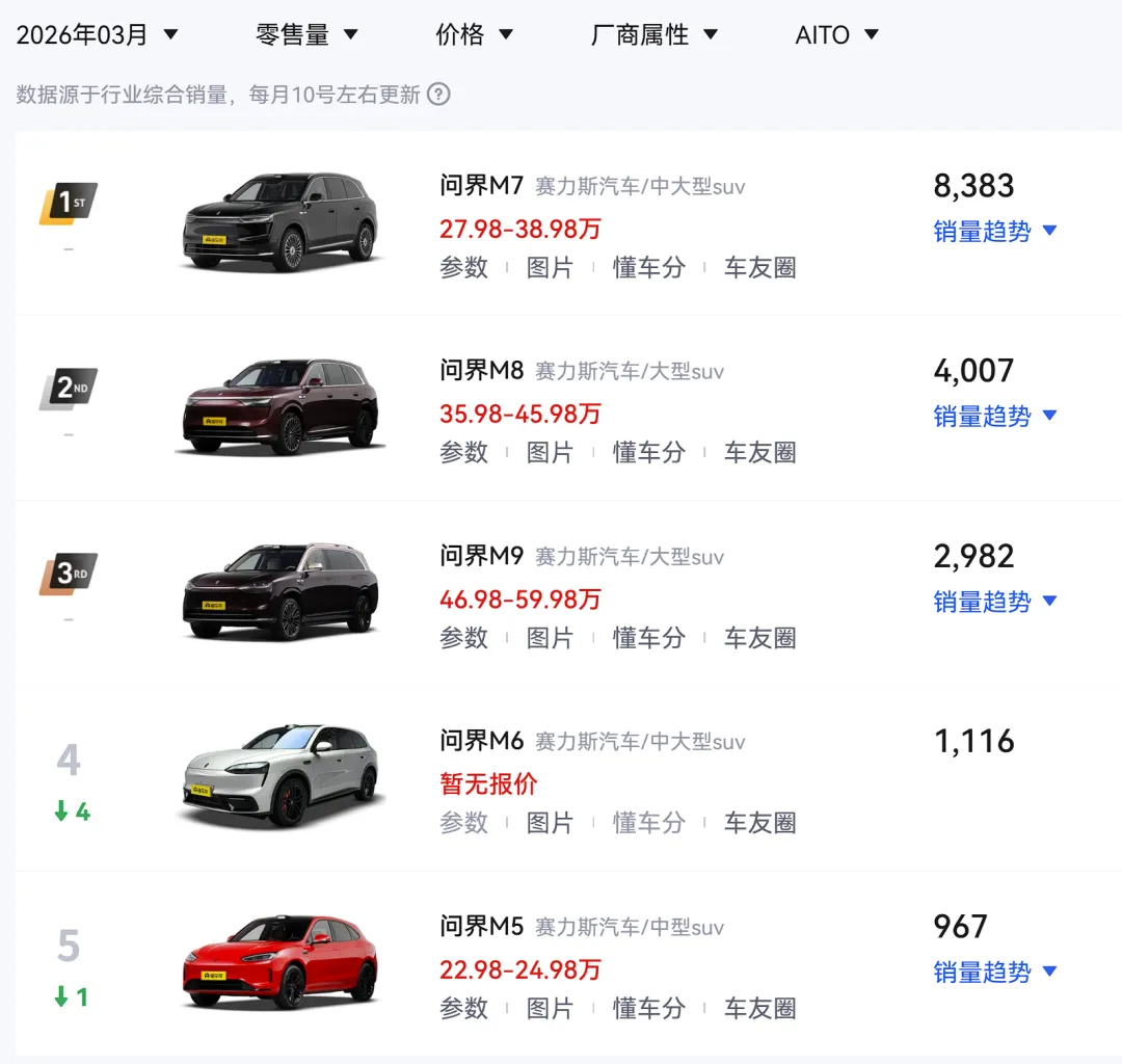 乘联会近日公布了3月份汽车销量(零售量),鸿蒙智行官方虽然没有公布销量,但从乘联会的数据来看,鸿蒙智行3月份的销量为26582辆,而赛力斯3月份的销量为20012辆(包括问界和蓝电),小米汽车3月份的销量为21440辆,这样来看的话,今年3月份问界的销量是不如小米的。赛力斯旗下的乘用车品牌主要是问界和蓝电,但是考虑到蓝电去年平均月销量一千多,所以绝大部分销量还是来自问界。去年这个时候“一米穿五界”的说法放在今年似乎不合适了,毕竟鸿蒙智行整体的销量还是高于小米汽车;另外,去年这个时候尊界S800(五月底才上市)还没有上市,所以只能说是“一米穿四界”,不能说“一米穿五界”,因为没有五界可以穿。从机构的数据来看,问界上个月的销量是17455辆,其中销量最高的是问界M7,销量为8383辆,几乎占了一半;另外,问界M8、问界M9的销量都不足五千辆,问界M9的销量甚至只有2982辆,这几乎是问界M9上市之后销量最低的水平。问界M9销量最高的时候,一个月能卖接近一万七千辆,要知道这是一款均价50万的车型,在同级别确实是遥遥领先;不过随着其他厂商发力大型SUV市场,问界M9的对手也越来越多,再加上大型SUV市场本身就这么大,其他厂商卖的多,那问界M9就卖得少。数据显示,三月份销量最高的大型SUV是蔚来ES8,该车型月销量超过1.6万,当然蔚来ES8只能算是40万级别的车型,和问界M8是同一级别的车型;但排名第二的是极氪9X,该车型的产品定价和问界M9高度重合,上月销量超过1万,是问界M9的三倍还要多。新款的问界M9实车也已经曝光,整体的设计更加硬朗,但依旧是1.5T增程器,并没有采用更高规格的增程器;不过新款问界M9大概率要在舒适性、科技化配置上做提升,性能毕竟不是问界的主要卖点。