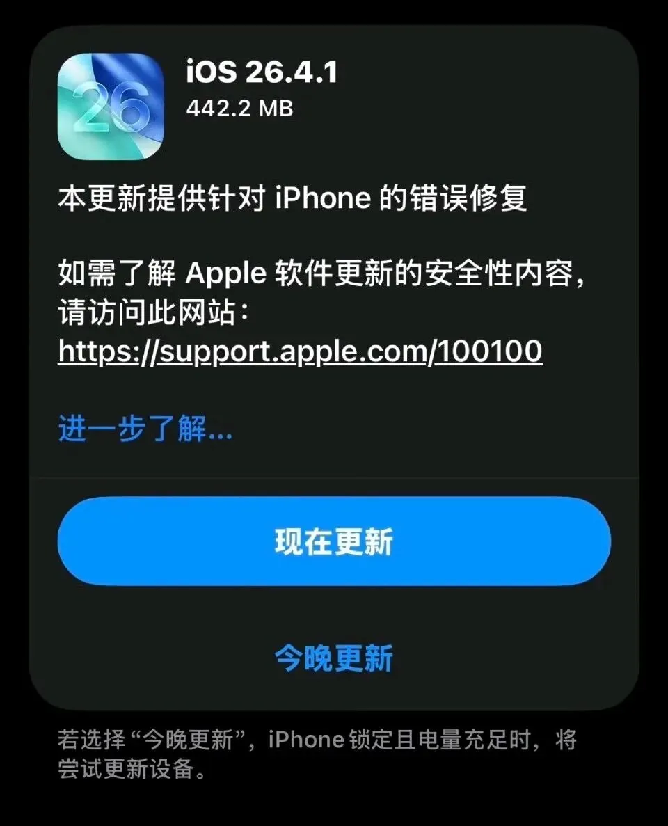 4月9日凌晨推送直接到来,iOS 26.4.1和iPadOS 26.4.1同时放出,内部版本号23E254,下载包五百到六百兆之间,更新里没有新功能,全是修修补补,针对26.4里那几处高频故障做处理,节奏上更像一场救火式更新。
