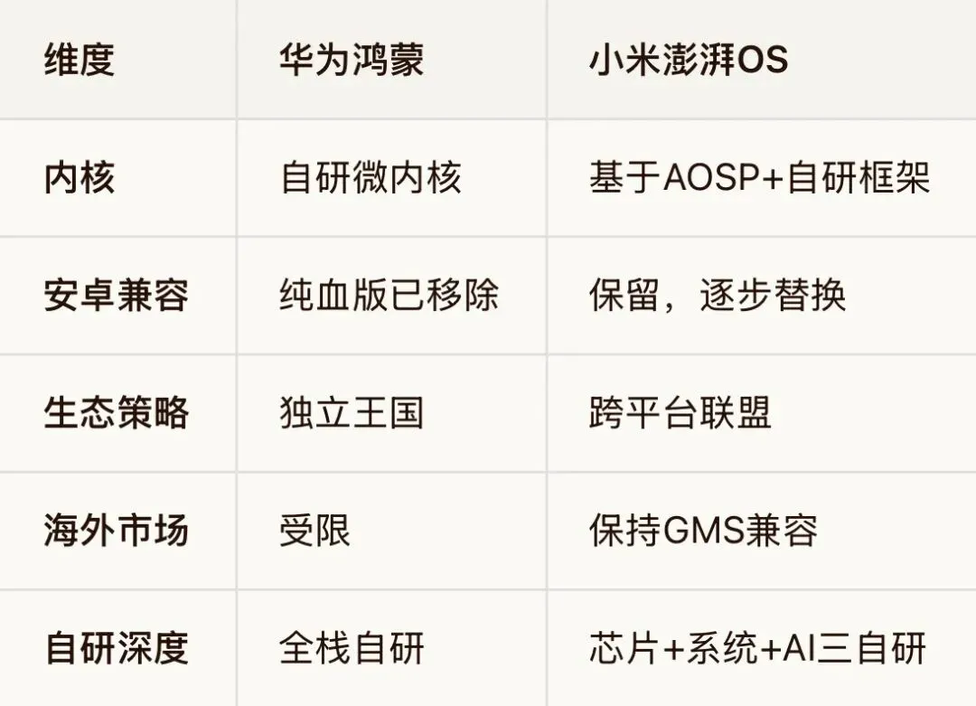 正如业内人士所说:国产自研本来就没有标准路径,适合自己的就是最好的。华为的纯血鸿蒙是外部环境倒逼出来的进攻,小米的渐进式澎湃是基于自身基本盘的稳步推进,两者没有高低之分。