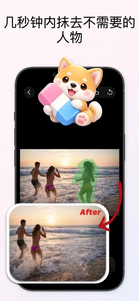 hello,大家好!今天给大家分享一款内购限免的神器——《狗狗橡皮擦》,这是一款非常好用的AI消除工具。借助本地AI秒删行人、物体和文字。所有操作都在设备上完成,保证隐私安全。软件支持中文!