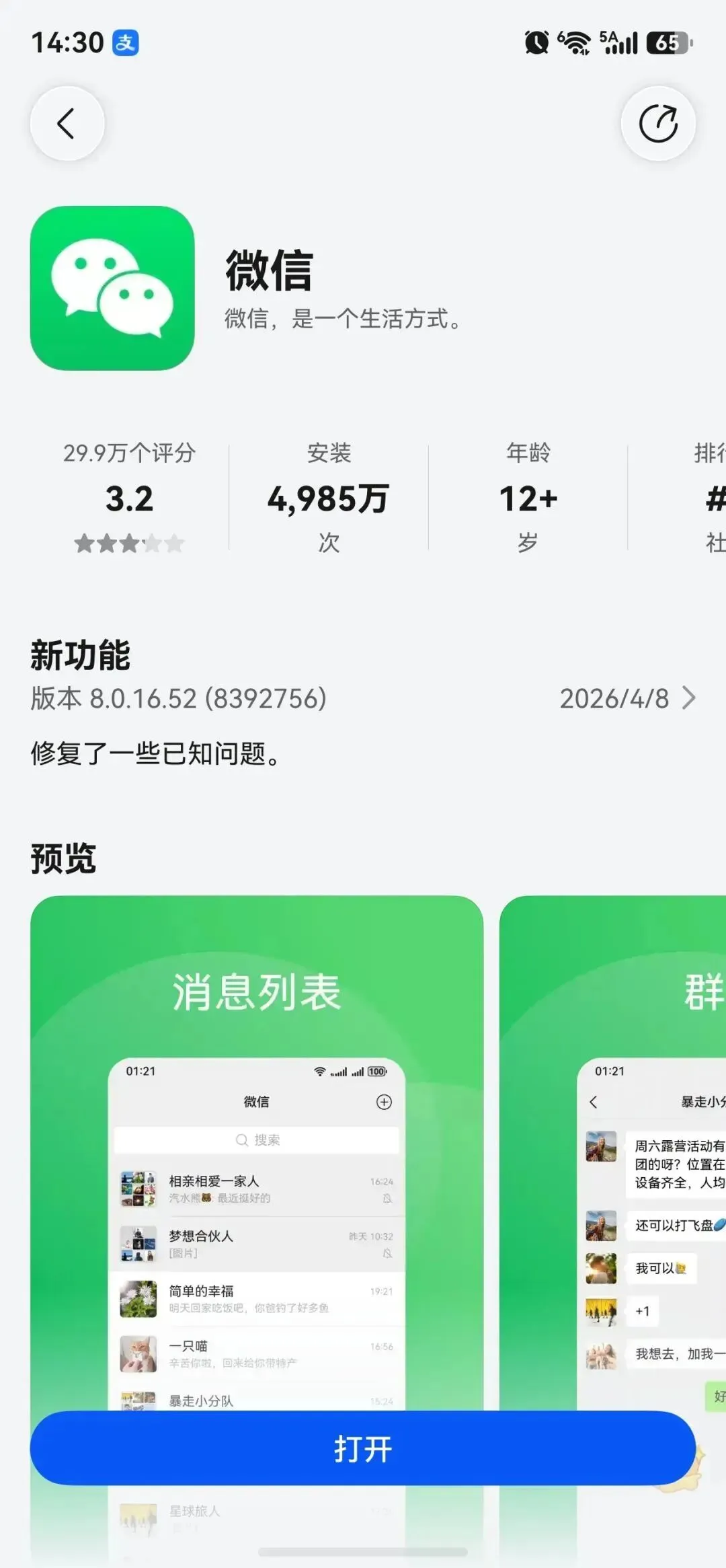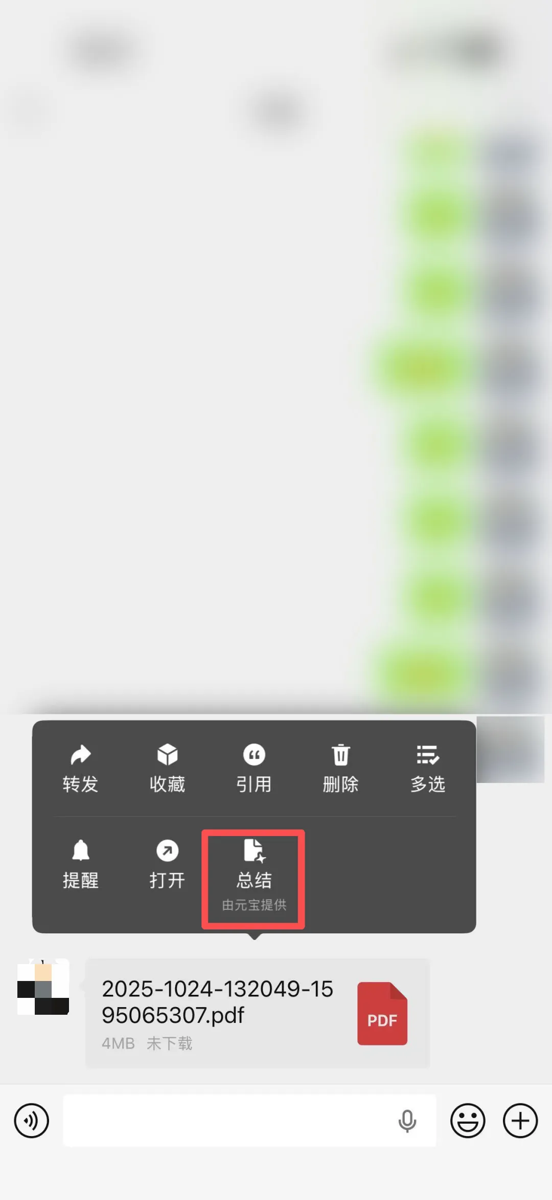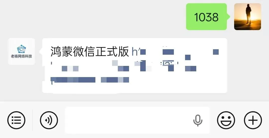 编飞扬大叔!微信团队在 4 月 7 日发布鸿蒙微信 8.0.16.51 正式版之后,于次日,又紧急上架发布了鸿蒙微信 8.0.16.52 正式版,如此短时间内接连更新正式版,预计是修复比较紧急的 bug。微信上线了 AI 总结聊天文件功能,若在聊天中收到了好友发送的文件(支持绝大多数常用的文件格式)或公众号文章链接,长按消息气泡,在出现的菜单中,新增了「总结」功能按钮。点击此按钮,即可跳转至腾讯自家的「元宝」App(手机中没有安装该 App 的,会提示安装),在「元宝」App 中点击「发送」按钮,元宝就可以直接总结该文件或文章内容。然后在对话框发送:1038 收到回复信息,点击链接下载安装使用,不是在评论留言区发送,在私信对话框,如下图。最后祝大家玩的开心