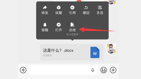 微信悄悄上线总结按钮,针对文档这类的文件进行 AI 处理分析,但它并非在微信上分析,需要依赖元宝APP进行分析。