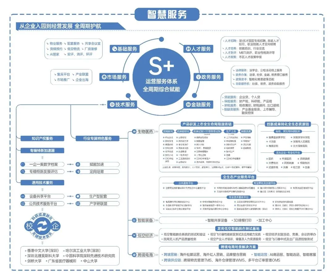 专业平台,全维服务:项目引进高水平研发、检测等专业技术平台,共享香港中文大学(深圳)、中科院深圳先进技术研究院的生物医药实验室平台,整合引进市区两级科技金融资源,设立技术服务平台、专业服务平台、金融服务平台、商务服务平台;同时发挥国企协同优势,创新打造基础、市场、技术、人才、金融、政务等S+全周期服务,为园区企业提供全方位的专业服务支持。