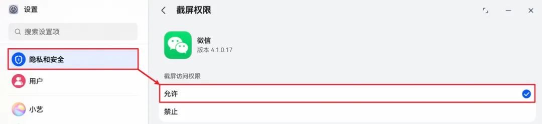 截图权限可以在设置中打开:前往设置>隐私安全>截屏,打开微信的截屏权限。