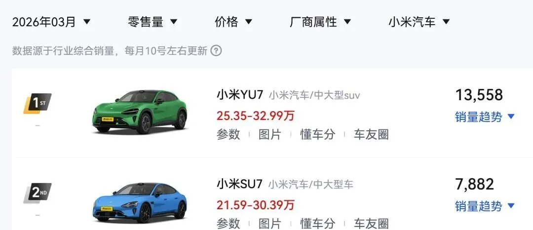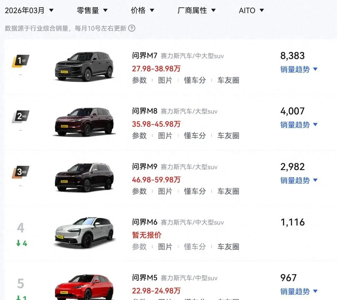 鸿蒙智行3月销量26582辆,问界不足两万不敌小米