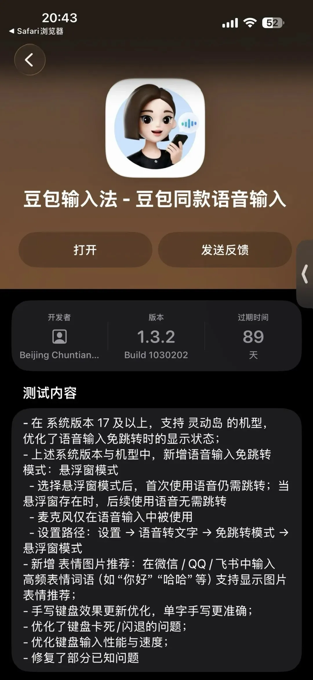 在豆包输入法最新的内测版本1.3.2中,新增了语音输入免跳转模式——悬浮窗模式。需要iOS版本在17以上,且手机有灵动岛。在开启悬浮窗模式后,首次使用语音仍需跳转,麦克风仅在语音输入中被使用,不再一直占用。