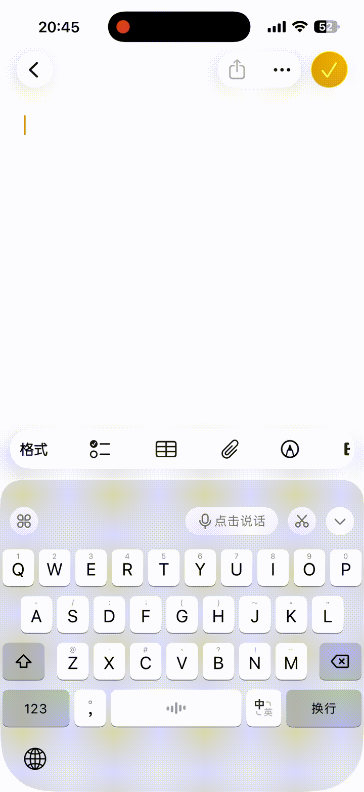 首次使用语音仍需要跳转,后续则不再需要跳转。可以看到,当后续使用语音输入法说话时,上方灵动岛的麦克风图标会亮起;说话结束时,麦克风图标会自动消失,语音输入法不再长期占用麦克风。但是代价是屏幕旁边会多一个折叠按钮,相当于长期把豆包输入法通过悬浮窗的形式放在了前台。个人实际体验下来,我认为这种方案优于长期占用麦克风的方案。一个是Siri可以正常恢复使用,另一个是灵动岛不会被麦克风长期占据,其他灵动岛信息也就不会被折叠。这种方式虽然仍然不如系统自带的语音输入法那么优雅,但也算是让iOS上的语音输入法跳转问题得到了比较好的解决。