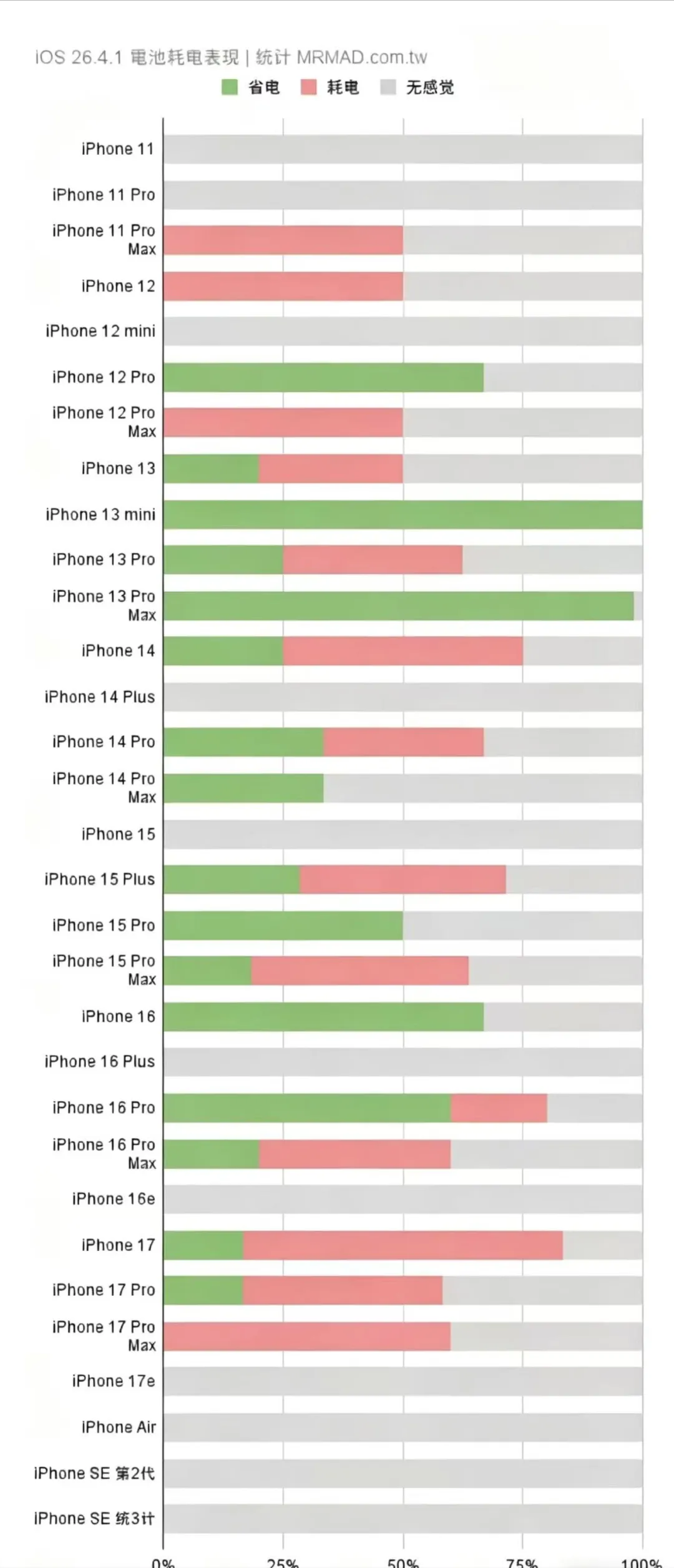 升级到iOS26.4.1续航没有变化的机型有:iPhone11、iPhone11pro、iPhone12mini、iPhone14plus、iPhone15、iPhone14pro Max、iPhone16E、iPhone17E、iPhone AIR、iPhone SE2、iPhone SE3等等。
