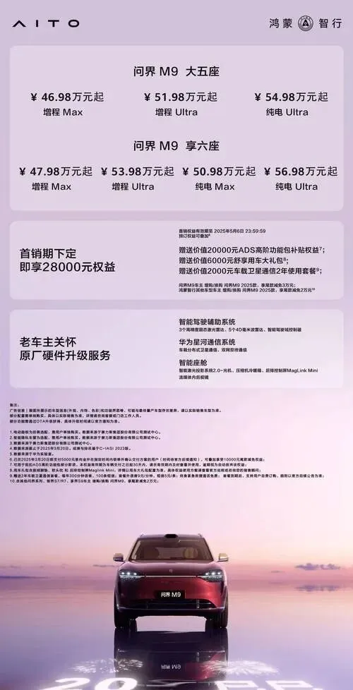 还有全面焕新的问界M9。作为鸿蒙智行目前的旗舰担当,M9不仅要守住高端定位,还要不断进化。这次的焕新版本,预计会在细节体验、软件功能以及部分硬件配置上进一步拉满,巩固其在50万以上高端市场的统治力。毕竟,高端用户要的不是将就,而是极致的享受和最新的科技尝鲜权。