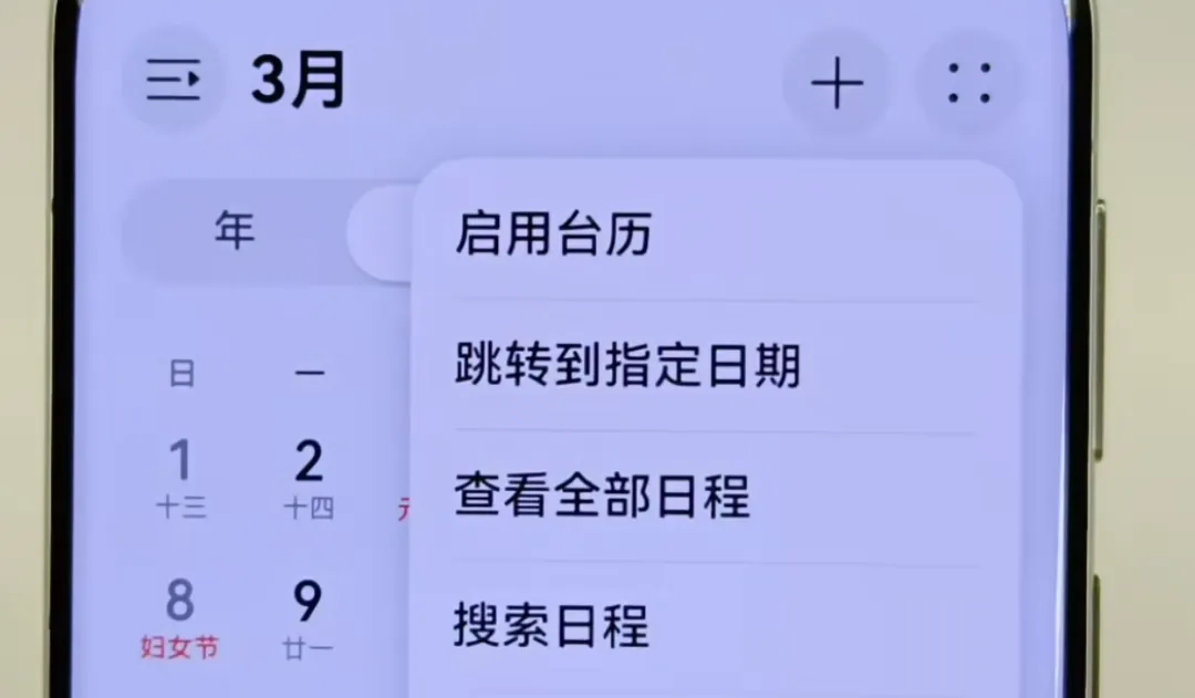 打开手机日历,默认是普通样式,其实隐藏了台历模式。点击右上角四个点,选择启用台历,就能切换成我们熟悉的台历界面。