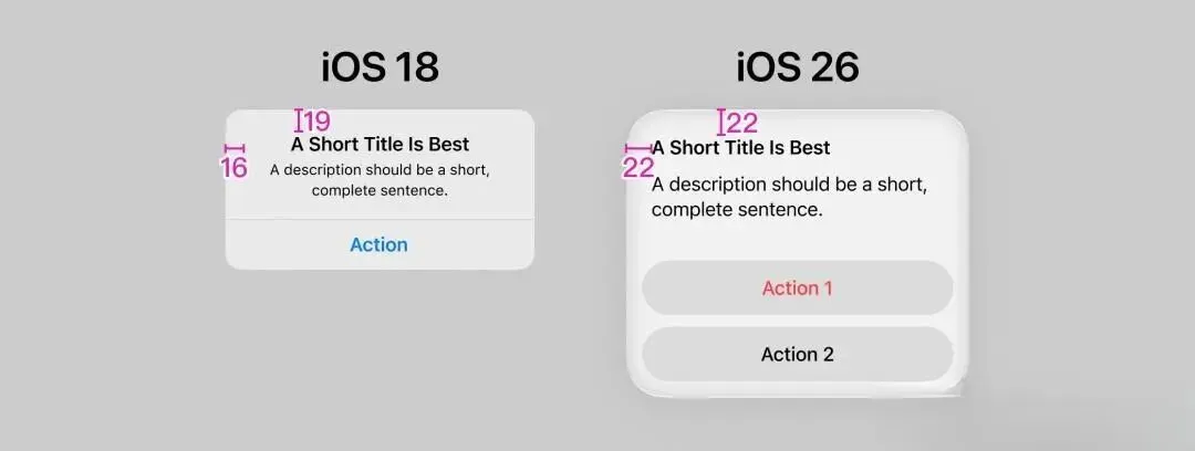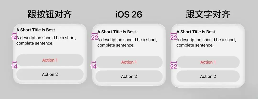 仔细观察iOS 26的弹窗你会发现一个细节:文字离边缘的距离,和按钮离边缘的距离完全不一样。如果强行统一边距,要么文字会贴在边缘显得局促,要么按钮会缩在里面显得小气。苹果最终的解决方案是:用两套边距分别适配。