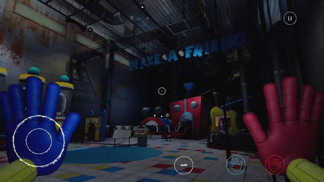 游戏最核心的玩法设计,完全围绕着名为GrabPack的抓取背包展开,这套装备也是玩家在工厂里唯一的依仗。它配备了两条可自由伸缩的机械手臂,既能远程抓取远处的道具,也能导电破解电路机关,甚至能在高压环境里搭建临时通路,或是在怪物追击时快速拉开距离、触发屏障,游戏里所有的解谜设计都与这套装备深度绑定,从基础的红蓝手印电路破解,到后续章节的复合型机关谜题,难度曲线循序渐进,既不会让新手卡关,也能给硬核玩家留足挑战空间。更关键的是,游戏彻底剥夺了玩家的战斗能力,面对工厂里游荡的变异玩具,玩家唯一能做的只有躲藏、逃跑、用机关拖延,这种极致的无力感,让每一次怪物的出现都带来窒息般的压迫感。
