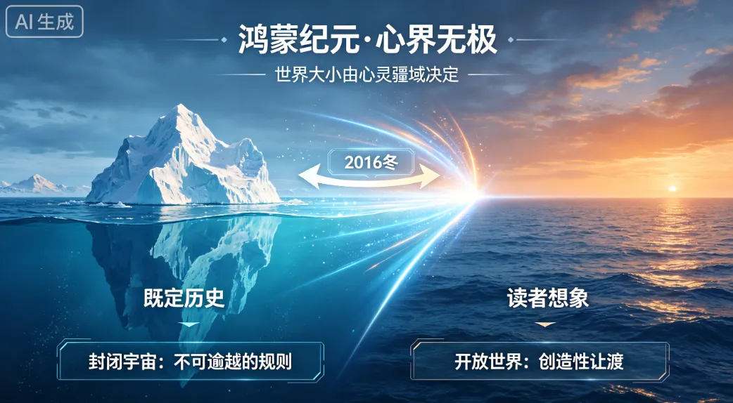 鸿蒙纪元的创生,源于一个朴素而深邃的认知觉醒:传统的世界观设定,无论其体系如何庞大、规则如何精妙,本质上都是一座精心雕琢的“冰山”。作者呈现给读者的,永远是水面之上的那部分;水面之下,是既定的、不可更改的历史;而托举整座冰山的海洋——读者的想象,却被无形地隔绝在外。