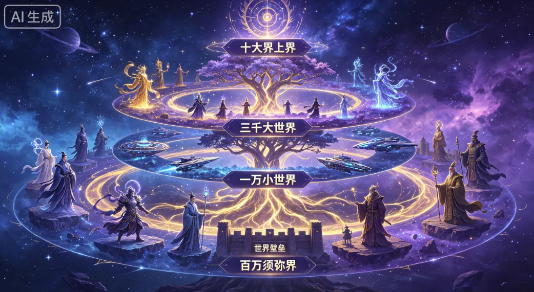 在鸿蒙的世界图景中,“诸天万界”不再是一个虚指的数量词,而是一个层次分明、逻辑自洽的宇宙结构。十大界上界、三千大世界、一万小世界、百万须弥界,构成了一个层层嵌套的宏伟阶梯。每一层都有其独特的物理规则、文明形态与力量上限,而连接这一切的,是那无形无相却又无处不在的“世界树”与“世界壁垒”。
