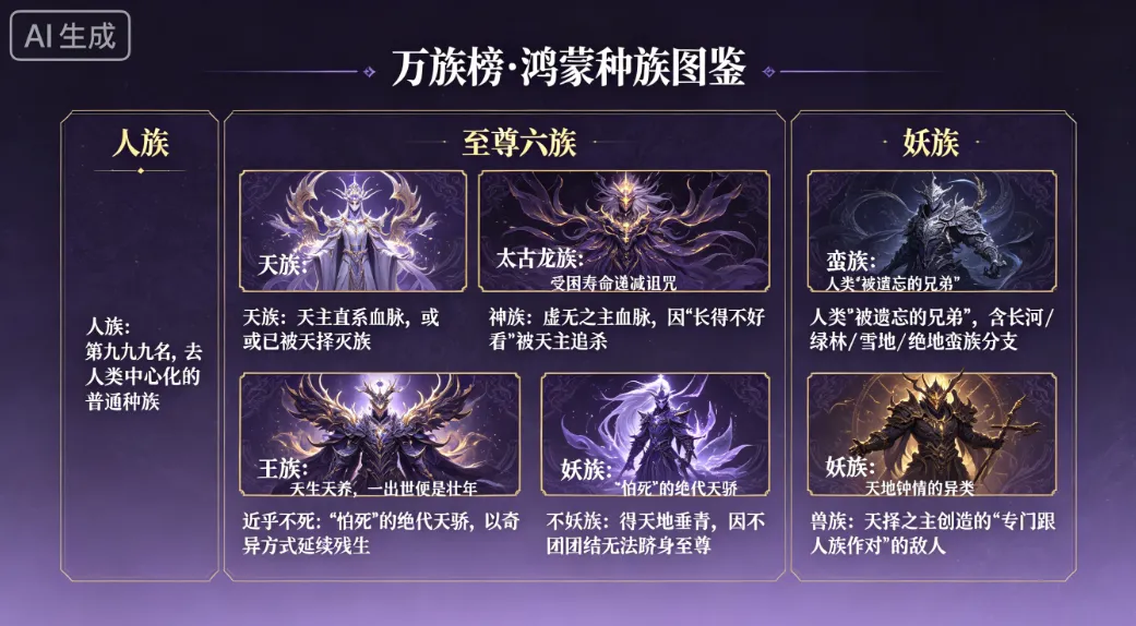 排名前六的“至尊六族”——天族、神族、太古龙族、王族、不死族、妖族,每一族都是某种文明理想的极致体现。天族承载着天主的直系血脉,却可能已被天择灭族;神族内流虚无之主的血脉,却受困于寿命递减的诅咒;太古龙族近乎不死,却因“长得丑”被天主追杀;不死族由一群“怕死”的绝代天骄组成,以奇异的方式延续残生;妖族得天地垂青,却因不团结而无法跻身至尊;王族天生天养,一出世便是壮年。这些设定,每一笔都是对某种生存哲学的叩问。