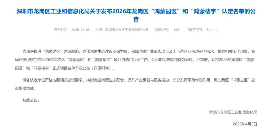 近日,深圳市龙岗区工业和信息化局发布了《2026年龙岗区“鸿蒙园区”和“鸿蒙楼宇”认定名单》。全区11个街道27个园区及楼宇入选,其中,宝龙街道2个项目入选,分别是智慧家园与湾区未来科技园。均位于宝龙科技城片区。为加快推进“鸿蒙之区”建设战略,强化鸿蒙生态建设支撑力度,保障鸿蒙产业重大项目及上下游企业落地空间需求,根据相关工作部署,我局已按程序完成2026年龙岗区“鸿蒙园区”和“鸿蒙楼宇”项目遴选和公示工作。公示期间未收到有效异议,经审核,现将2026年龙岗区“鸿蒙园区”和“鸿蒙楼宇”正式项目名单予以公布(详见名单可点击文末阅读原文查看)。