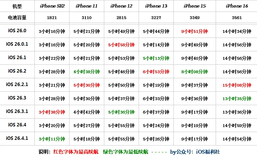从此UP主测试结果来看,相比于 iOS 26.4 系统的电池续航的具体数据:iOS 26.4 正式版电池续航整体趋势是非常稳定的,个别机型续航差值就几分钟。误差范围内,续航基本是稳定的。全部的 iOS 26 系统续航水平对比数据如下图示。 注意事项