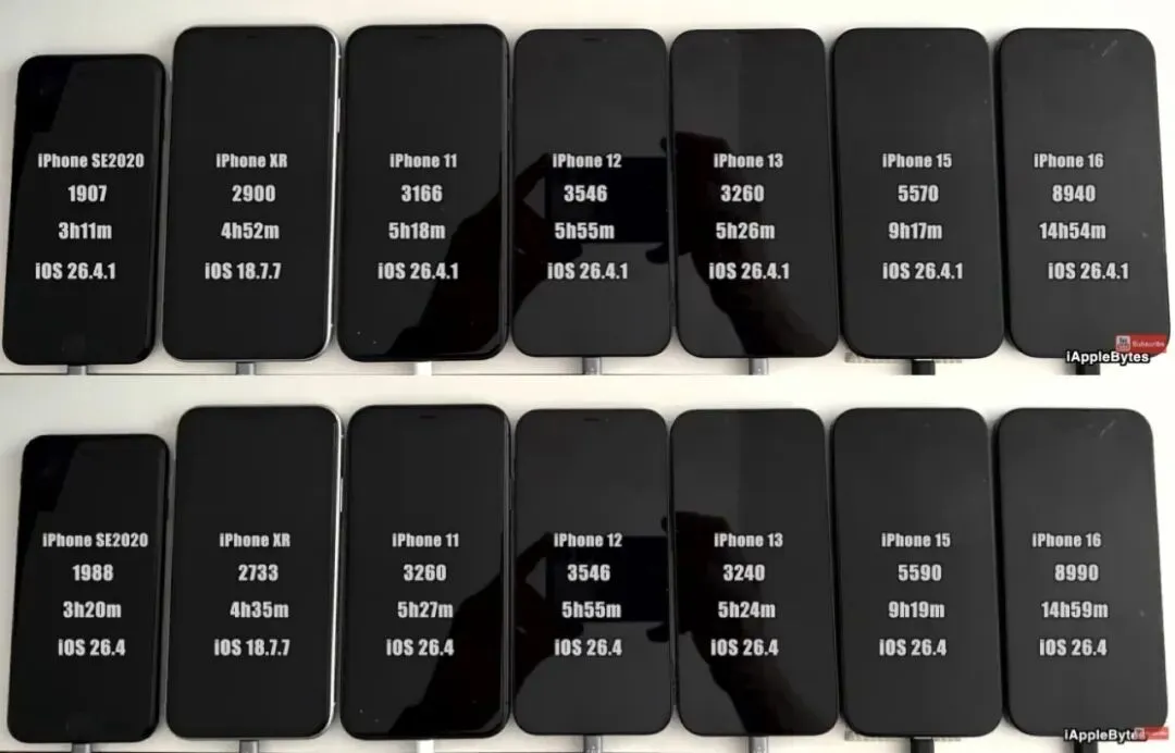 原本以为可以把iOS 26.4.1正式版可以当做iOS 26系统的养老版本,但似乎还不是最合适的养老版。从油管博主iAppleBytes的续航测试来看,各iPhone机型在升级iOS 26.4.1正式版后的续航表现仍是
