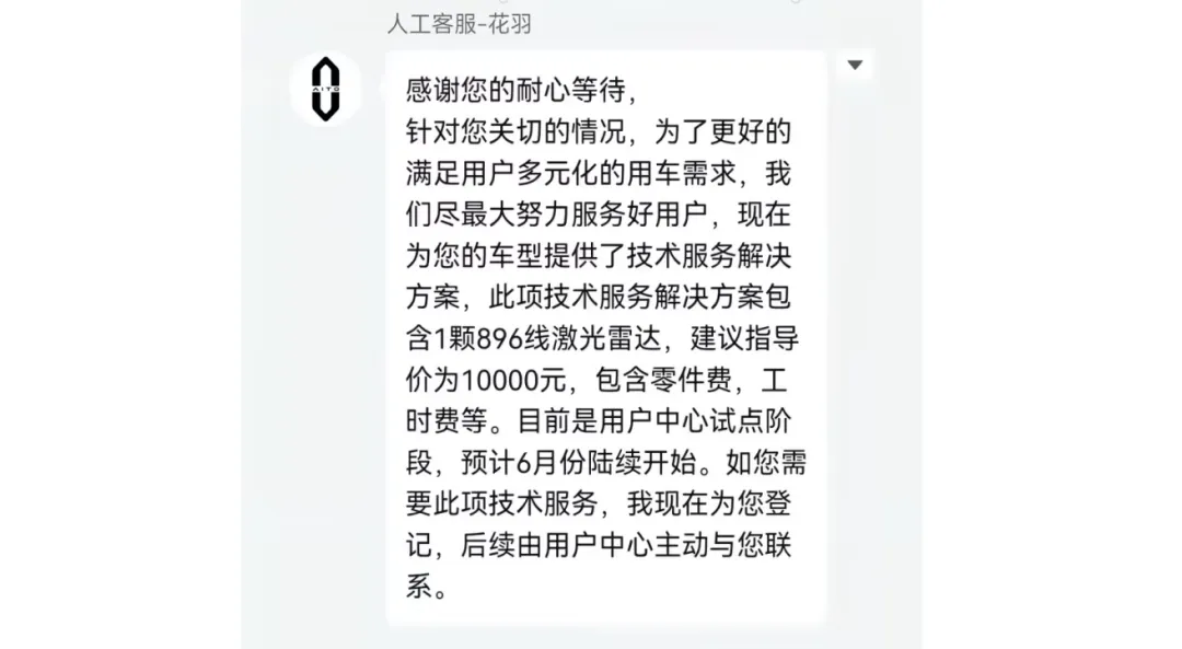 4月12日消息,根据问界官方客服消息确认,鸿蒙智行问界官方将在今年6月份提供896线程雷达升级服务,费用为1颗1万元,包含零件费,人工费。但因技术以及法规原因,部分老款车型暂不支持升级服务。据了解,由于技术原因,只有部分车型支持付费升级服务,首先搭载192线方案新M7、新M8、25款M9适用此次896线雷达升级服务,费用为1万元1颗,且该升级仅包含单颗前向896线激光雷达,不包含车侧固态激光雷达。前期仅在部分城市开启试点,后续开放至全国各地。24款问界M9由于技术原因,仅提供辅助驾驶安全硬件配置统一提升至与25款M9完全一致,且需要额外支出5万元费用。此前3月23日,华为官方举行全场景新品发布会,推出了全新搭载 896 线双光路图像级激光雷达的问界 M6,以及“瑞红”“湛蓝”配色问界 M8、“暗夜紫”车配色问界 M7。此次发布会引起众多问界老车主的极度不满,称官方更新换代过快而背刺旧款车型车主,甚至有部分客户提车不到一月时间便遭遇车型更新换代。而官方表示正在积极寻找补偿方案!此次推出的896线程激光雷达升级服务相比也是为满足部分车主的诉求!值得一提的是新推出的目前量产最高规格的896线激光雷达精准度提高了4倍,雷达扫描点云密度显著提升,可精准识别100米外高度仅 14 厘米的障碍物,增强对低矮路沿、异形物体及行人姿态的感知能力。而此前刚推出的问界 M6座位家族定位新锐智慧 SUV,全系搭载896 线双光路激光雷达以及华为乾崑 ADS 4.1智驾方案!