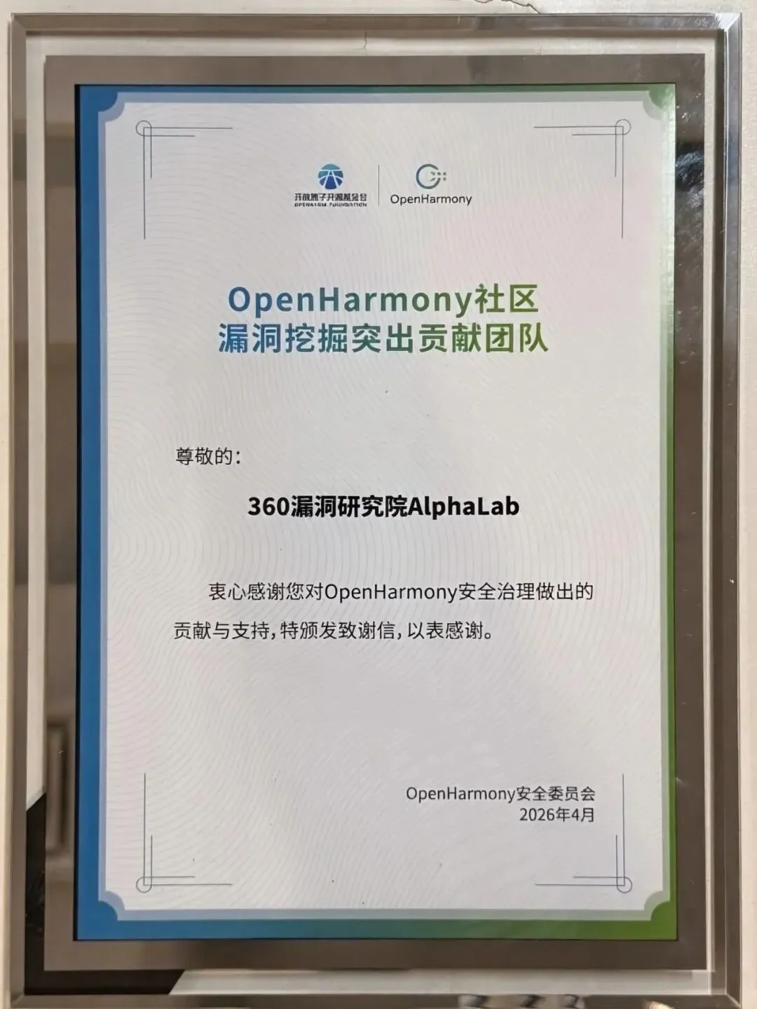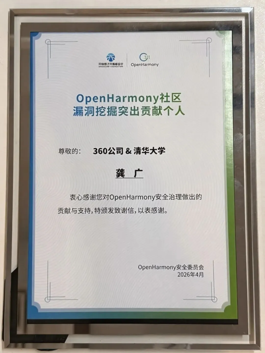 近日,360数字安全集团漏洞研究院成功斩获2026年度“开源鸿蒙社区漏洞挖掘突出贡献团队”称号。与此同时,360龚广也荣膺同年度“开源鸿蒙社区漏洞挖掘突出贡献个人”殊荣。