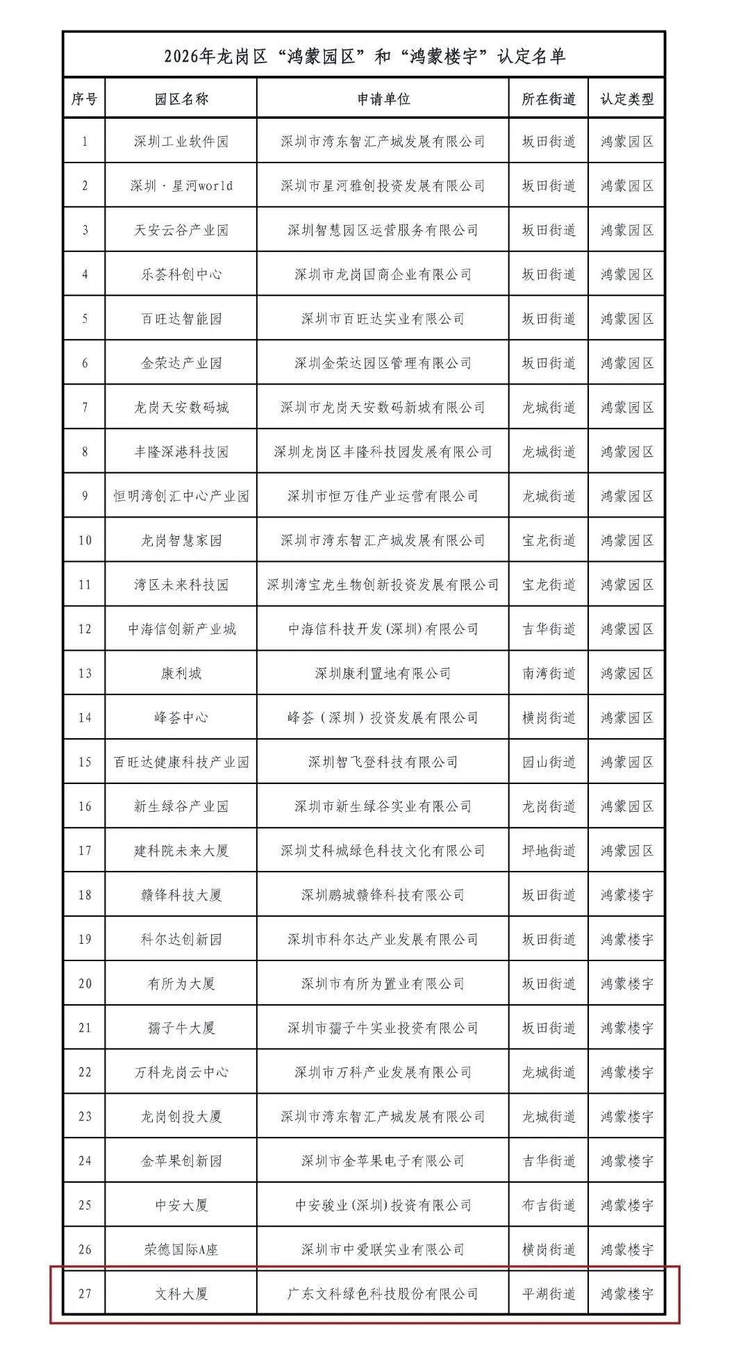 4月13日,深圳市龙岗区工业和信息化局正式发布2026年龙岗区“鸿蒙园区”和“鸿蒙楼宇”认定名单,广东文科绿色科技股份有限公司(简称文科股份,股票代码002775)旗下核心产业载体——文科大厦成功获评“鸿蒙楼宇”。这一认定标志着文科大厦在鸿蒙生态企业承载与服务能力方面获得官方认可。