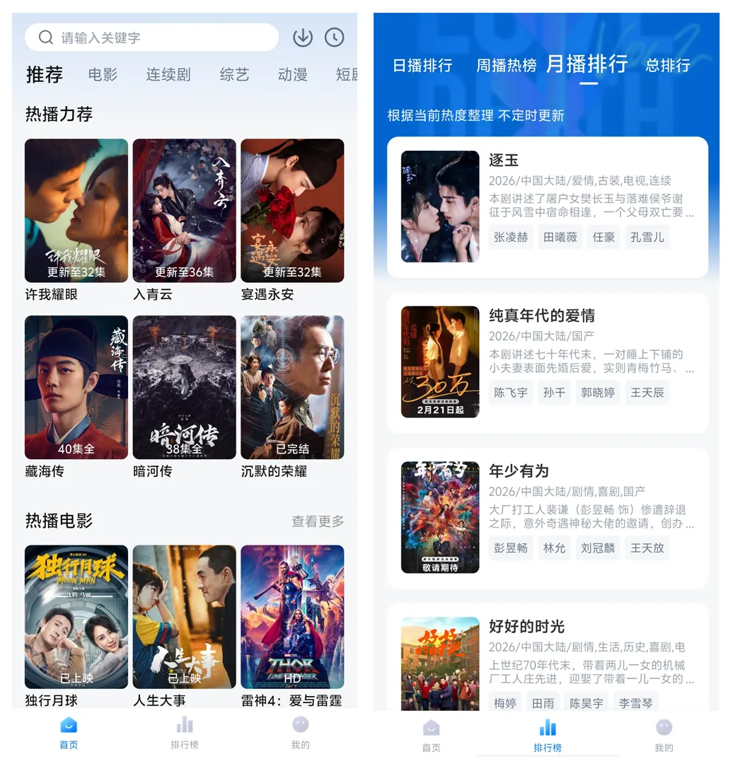 打开软件后,我们可以看到它包含了:电影、连续剧、综艺、动漫、短剧等众多分类,而且它还有热剧排行榜,足以满足我们日常的观影需求。