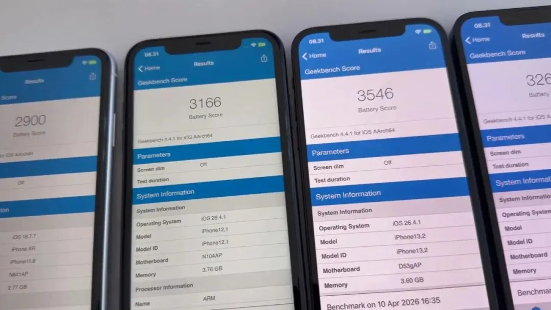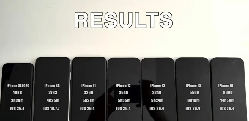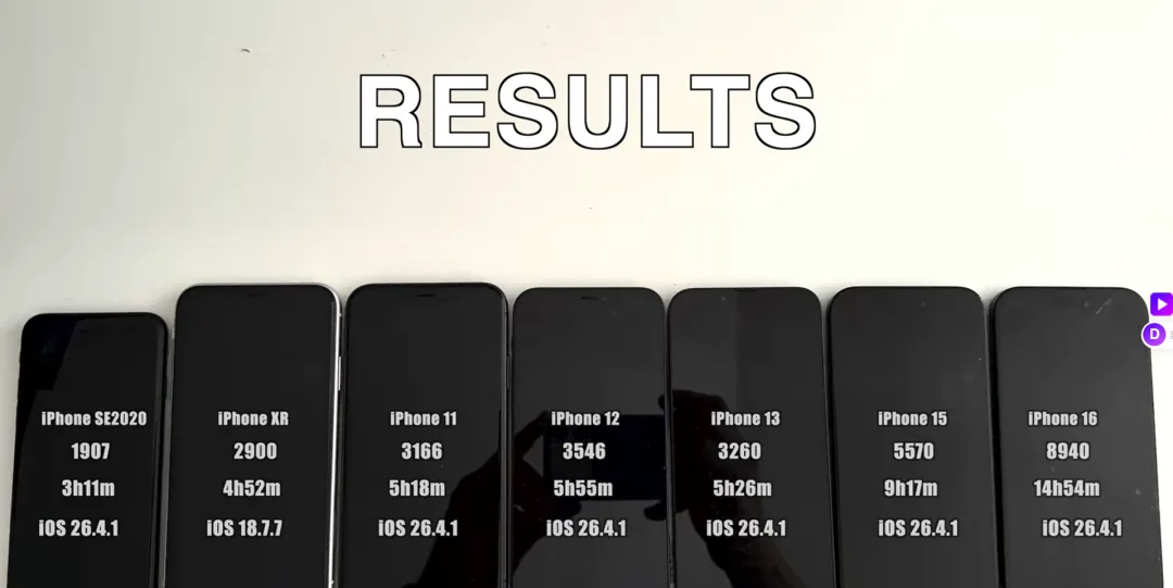 苹果iOS系统更新太频繁了吧!3月底才刚刚推出iOS26.4正式版,不到两周的时间又更新iOS26.4.1。这次iOS26.4.1虽然只是小更新,但还是修复部分漏洞。但对于旧款iPhone的续航是否有所提升呢?最近国外博主就将iPhoneSE2、iPhone11、iPhone12、iPhone13、iPhone15、iPhone16等6款机型进行电池续航测试对比。来看看这6款旧iPhone在升级iOS26.4.1后,与iOS26.4相比,耗电速度变化到底有多大!由于是满负荷状态下测试,只实测续航变化,而实测续航时间并非日常使用时间,毕竟每个人的使用习惯不同。将这6款旧iPhone充满电,升完级后,正式开启测试!经过极限续航测试后,运行iOS26.4.1续航结果如下:iPhoneSE2:测试续航时间3小时11分钟,电池跑分1907iPhone11:测试续航时间5小时18分钟,电池跑分3166iPhone12:测试续航时间5小时55分钟,电池跑分3546iPhone13:测试续航时间5小时26分钟,电池跑分3260iPhone15:测试续航时间9小时17分钟,电池跑分5570iPhone16:测试续航时间14小时54分钟,电池跑分8940再将这6款旧iPhone运行iOS26.4.1与iOS26.4的电池续航时间做对比:iPhoneSE2:升级后续航时间下降9分钟,电池跑分下降81分iPhone11:升级后续航时间也下降9分钟,电池跑分下降94分iPhone13:升级后续航提升2分钟,电池跑分提升20分iPhone15:升级后续航下降2分钟,电池跑分下降20分iPhone16:升级后续航下降5分钟,电池跑分下降50分整体来看,iPhone12和iPhone13值得升级,只有这两款旧iPhone升级后续航没有下降,还是值得升级。反观另外四款旧机型,下降幅度最大的是iPhoneSE2和iPhone11,都降了9分钟,说明耗电量更大,不值得升级。各位小伙伴们,你们手里的旧款iPhone升级iOS26.4.1后,续航是下降了还是提升呢?