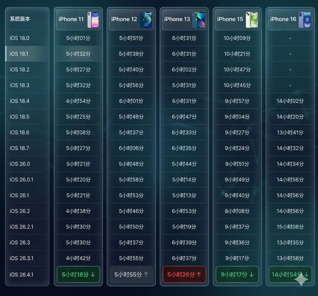 iOS26.4.1版本的iPhone11续航5小时18分,iPhone12续航5小时55分、iPhone13续航5小时26分。
