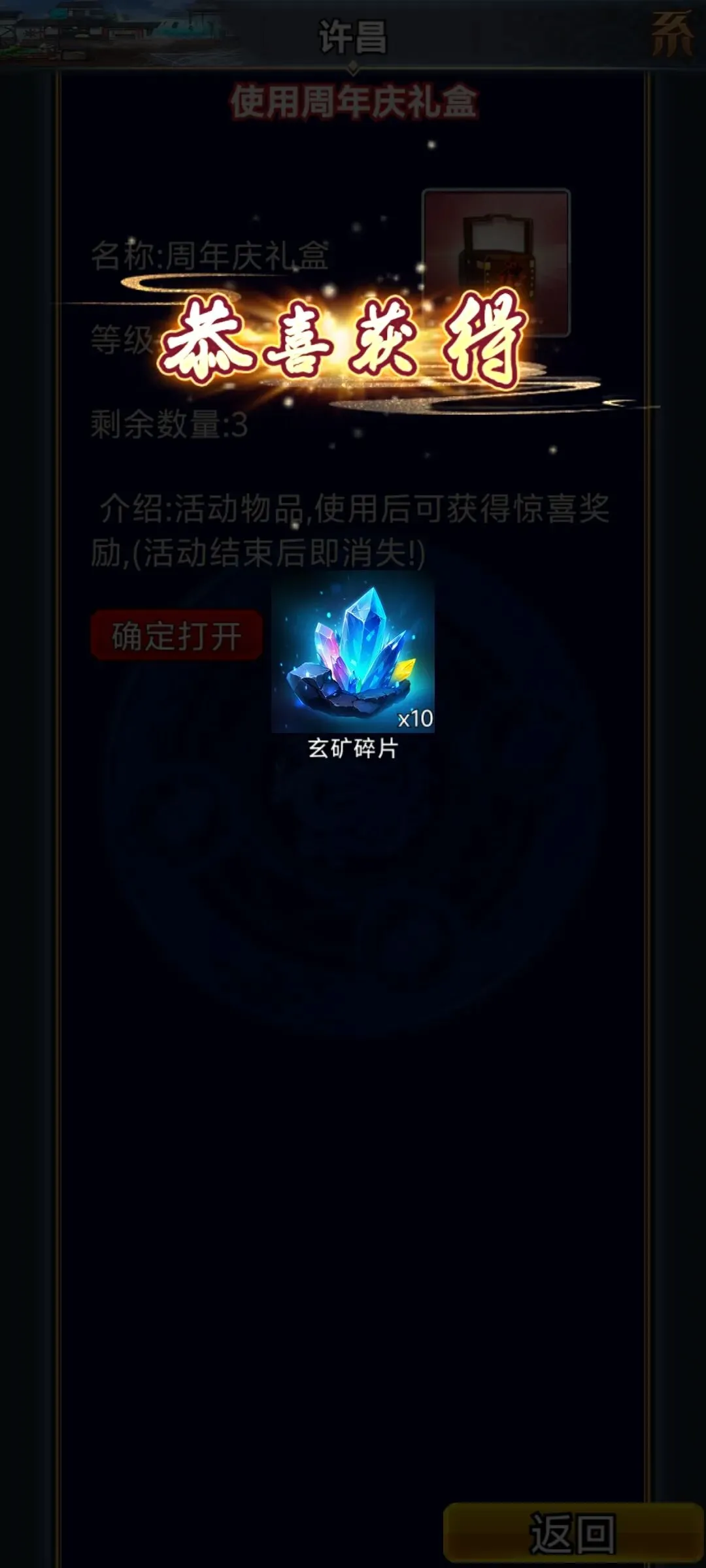 从上面看到,本次开宝箱,宝箱数量是两个两个减少的,但是给的东西确实一个一个增加的,下面给视频中几个容易发现问题的节点你们可以观察一下 节点1:视频中1分08秒的时候,背包里面将军令的数量为261个,宝箱数量为60个,1分15秒的时候,开宝箱提示获得了将军令一个,返回仓库查看将军令数量变为262个,宝箱数量从58个变成了56个,所以,我点了一次普通宝箱,宝箱数量消耗了两个,开出来的东西却只给了一个。策划你过来教教我这是怎么做到的😡😡😡😡😡 节点2:同样视频中1分23的时候,背包里面将军令的数量为262个,宝箱数量为54个,同样的,点击开宝箱,将军令数量从262变成了263个,宝箱数量从54个变成了52个。所以,策划我的宝箱去哪了。。。节点3:视频中2分23秒的时候,宝箱数量显示为2个,点击开宝箱一次,后面直接提示:您没有宝箱可以打开了! 总结一下:个人感觉,开普通宝箱的时候数量如果为双数,普通宝箱数量会两个两个的减少,给的东西却是一个一个增加,后面我也试了去跳蚤市场买了一个宝箱单独开了一个实验了一下,也是可以打开的,后面我也去开了高级宝箱,数量也是正常一个一个减少的,视频没有录上去,你们也可以自己试验一下。 再来个贴图,展示一下这几天周年庆开到的玄矿碎片截图 另外周年庆幻三联动西游获取限时副将的活动大家记得有空也可以参与一下,虽然对于幻三玩家稀有常人副将基本上没有什么用,初值就成长仅仅比常人龙飞强一点点,其他初值基本跟龙飞持平,但是有一定的收藏价值,毕竟是限时获取的绝版常人。 西游小号的升级攻略大家可以去看下四舅的公众号,上面基本上都是挺全的。不想氪的三天左右跟着任务走就可以达到30级,毕竟周年庆三倍经验升级也挺快的,想氪的话,氪个十块的,买几个体力丹去刷白骨,基本上一天就可以到达30级,到时候别忘记签到就可以了。 同时提醒大家:交易需谨慎,大额交易可以找信得过的中介或者选择游戏当铺金砖交易,尽量不要贪小便宜吃大亏。如果有被骗的经历,请私信我防止更多人上当受骗,谢谢!!!
