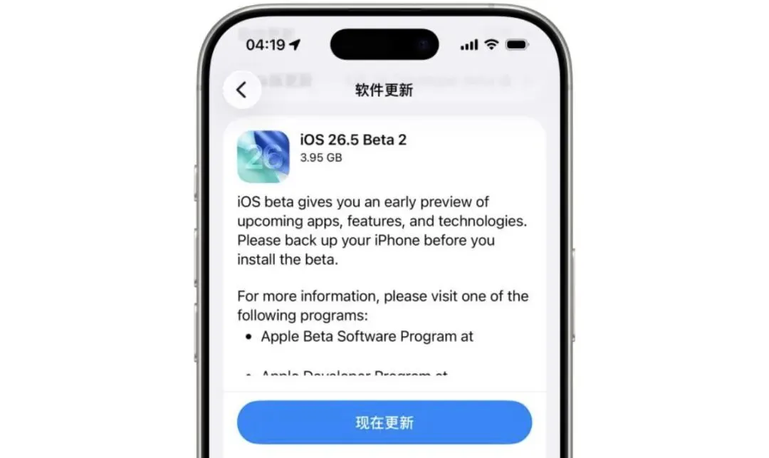 今日凌晨(4月14日),苹果发布了iOS 26.5开发者预览版Beta2(内部版本:23F5054d),本次更新国行AI依然没有,主打安全修复、功能优化与合规调整,并无重磅新功能。
